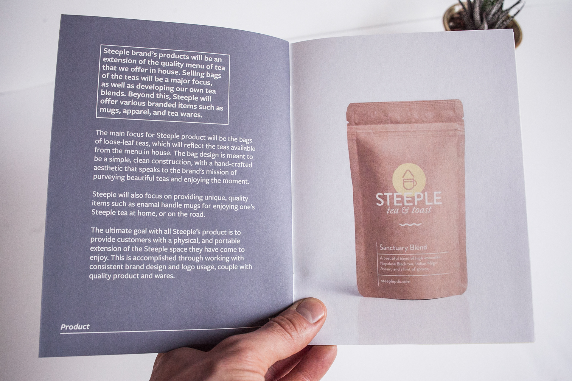 Steeple is a proposed food and beverage concept designed with quality and hospitality in mind. The brand book for the Steeple tea & toast brand is a saddle-stitched 5.5" x 8" inch booklet with a cotton cover. I designed a cohesive brand guideline system to help inform the brand and the many ways of expressing Steeple to it's audience.